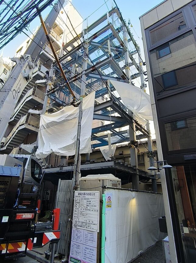 恵比寿の計画は、昨秋に着工し、今日鉄骨建て方が無事完了しました。小さいビルですが、5階建てとなるとそれなりに迫力があります。