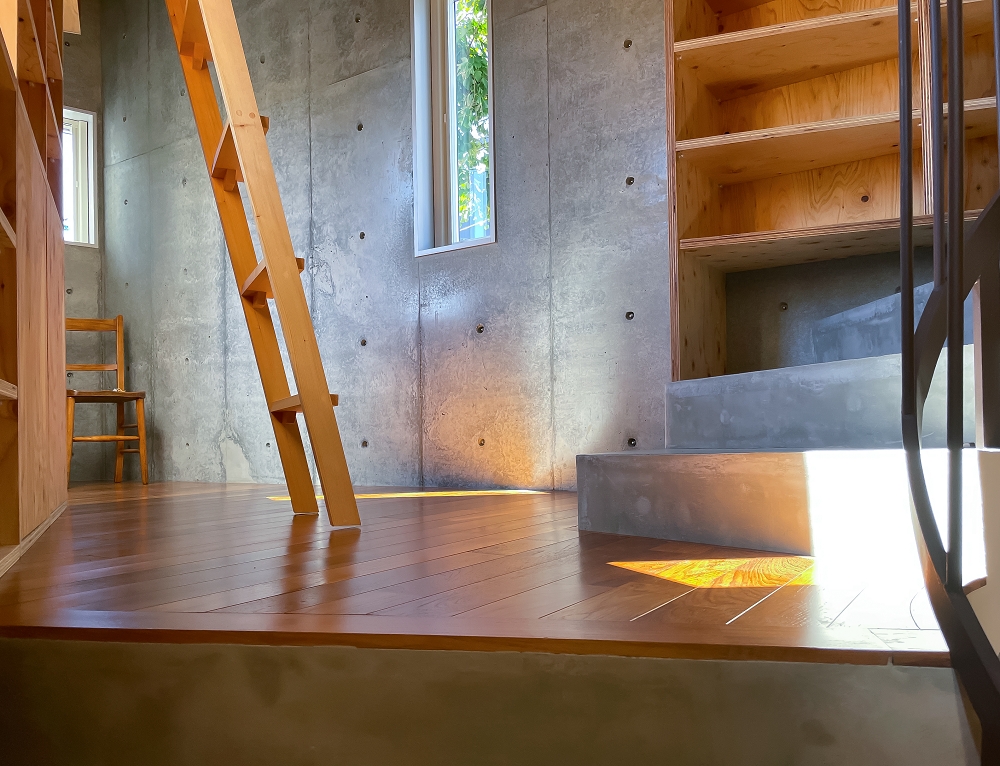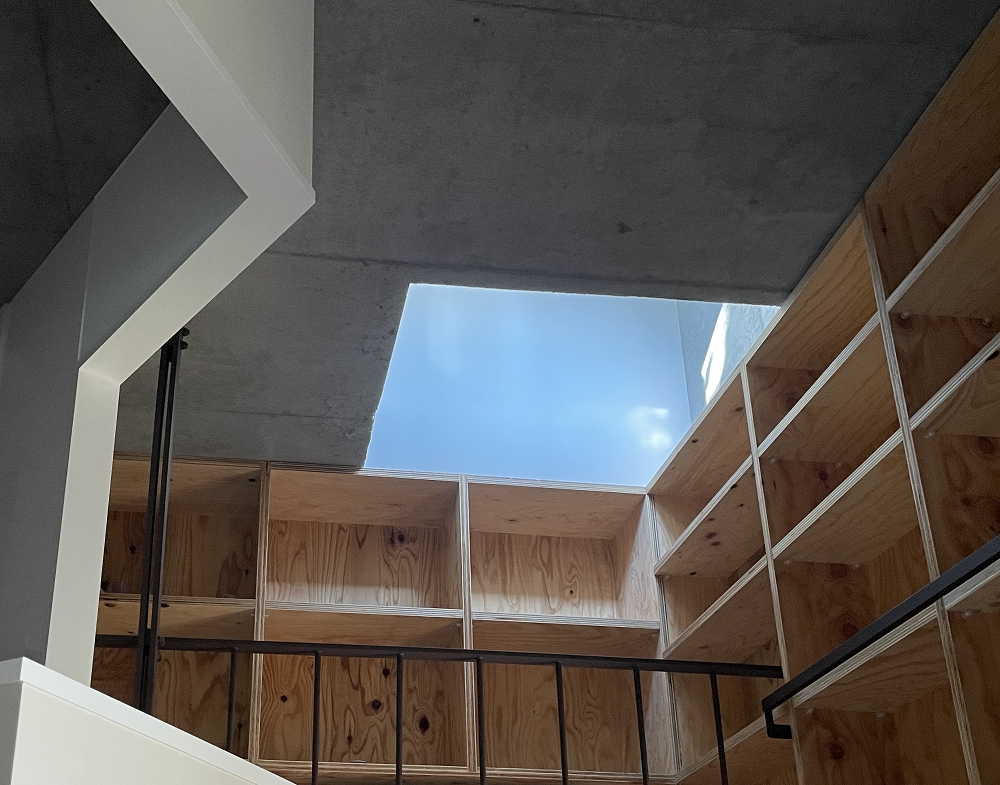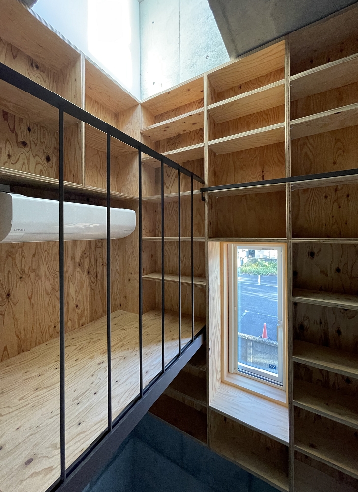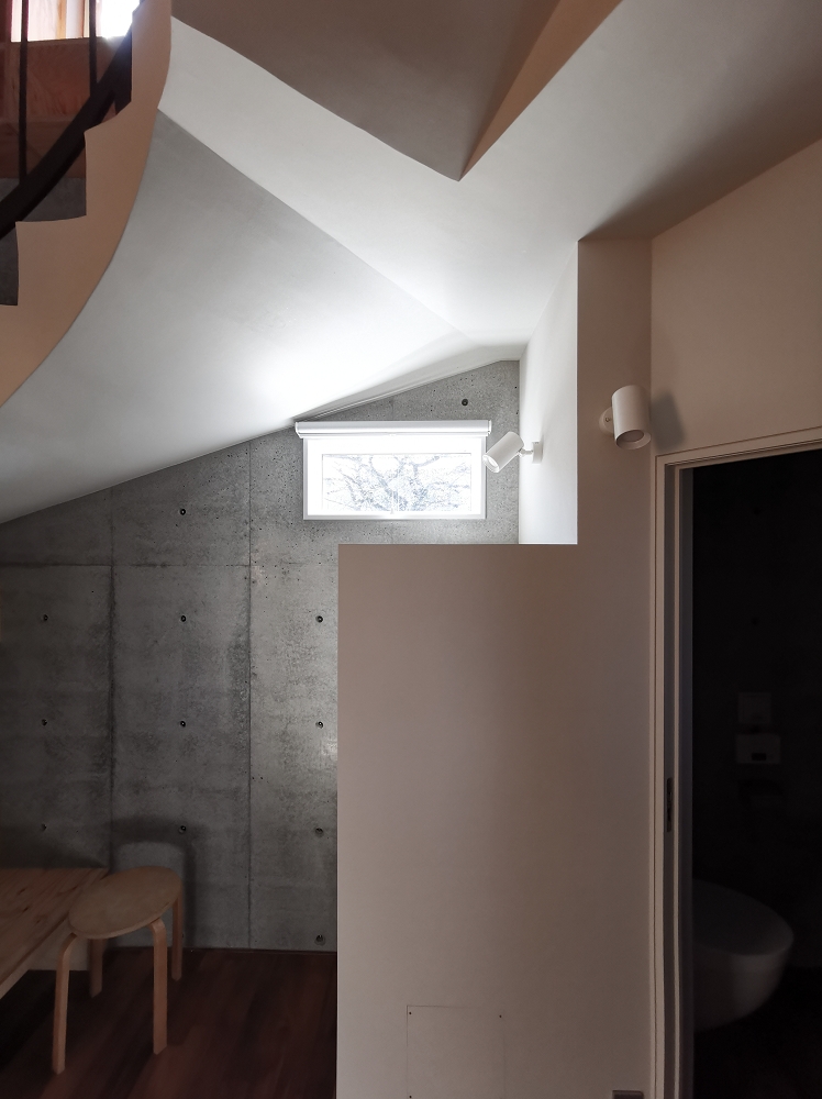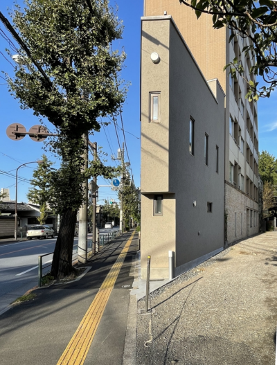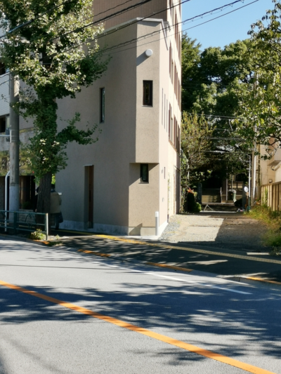 もちろん私たちはデザイン、性能、ディテールに深く関わっています。外観はまるで隣接するマンションの付属建物であるかのような似通った無難な色調としています。風景に埋没しデザインが突出しない「普通」の状態を目指しました。住宅の外観はできるだけ主張の少ないものにしたいと常に考えていますが、寺院とその境内の緑が多い落ち着いた土地柄から特にそういうあり方が良いと思いました。しかし近くに寄れば、給湯器や室外機等の設備が外壁に付着していないことや、途切れることなく塗りまわされた左官仕上げなどで、普通とは少し違う様子がわかります。この左官材は外断熱に直接塗られています。内部では面積に比して多くの「居る場所」ができました。写真撮影に予想以上に時間がかかったときにそれが実感されました。多様な場所は小ささを払拭するに十分な心理的な広がりをつくっています。