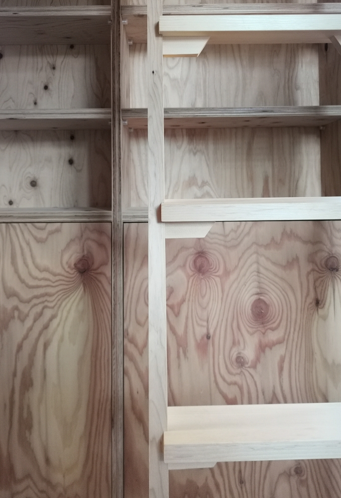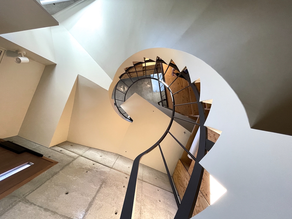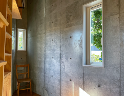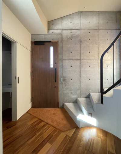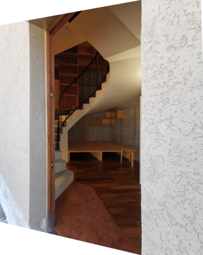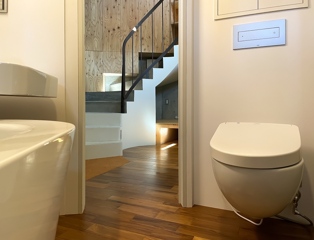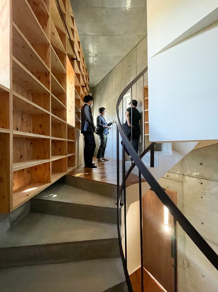 もちろん私たちはデザイン、性能、ディテールに深く関わっています。外観はまるで隣接するマンションの付属建物であるかのような似通った無難な色調としています。風景に埋没しデザインが突出しない「普通」の状態を目指しました。住宅の外観はできるだけ主張の少ないものにしたいと常に考えていますが、寺院とその境内の緑が多い落ち着いた土地柄から特にそういうあり方が良いと思いました。しかし近くに寄れば、給湯器や室外機等の設備が外壁に付着していないことや、途切れることなく塗りまわされた左官仕上げなどで、普通とは少し違う様子がわかります。この左官材は外断熱に直接塗られています。内部では面積に比して多くの「居る場所」ができました。写真撮影に予想以上に時間がかかったときにそれが実感されました。多様な場所は小ささを払拭するに十分な心理的な広がりをつくっています。