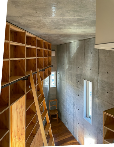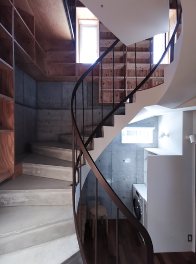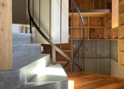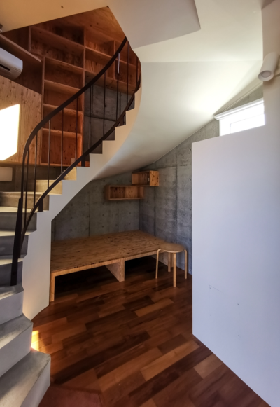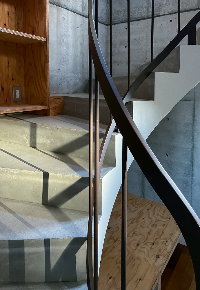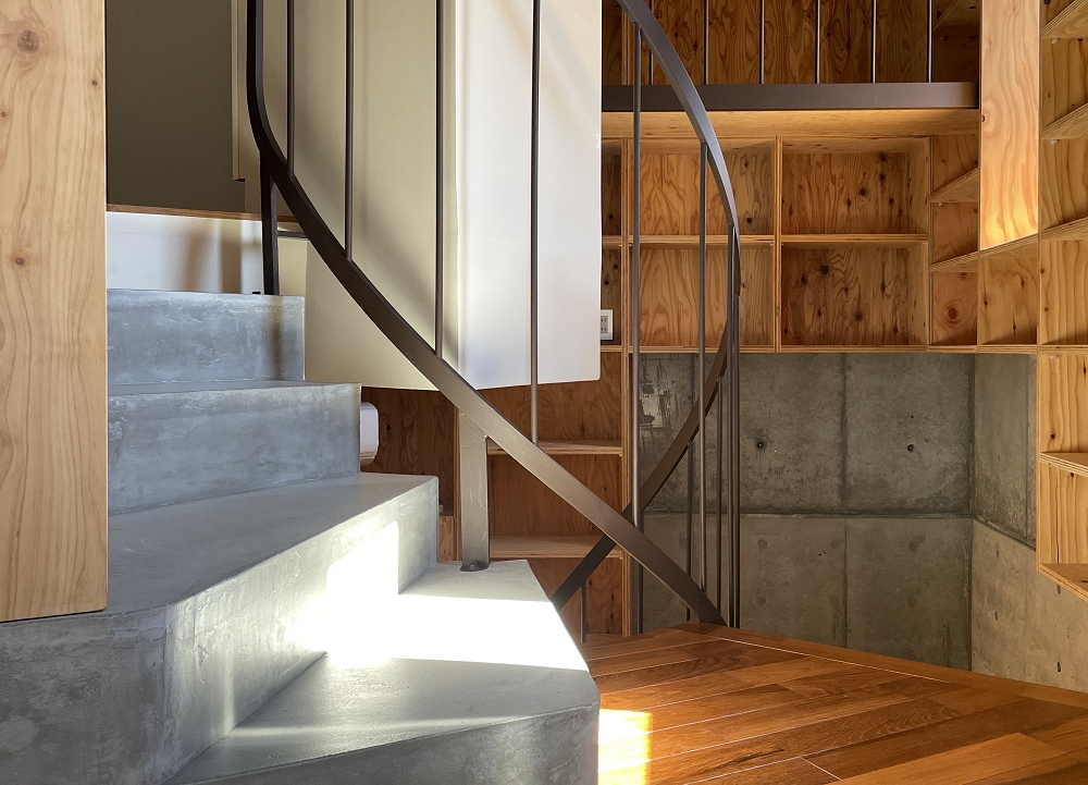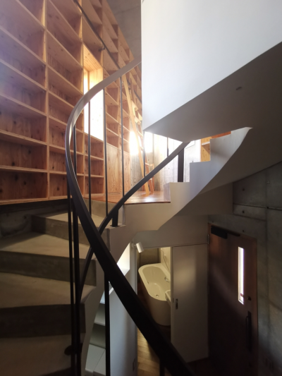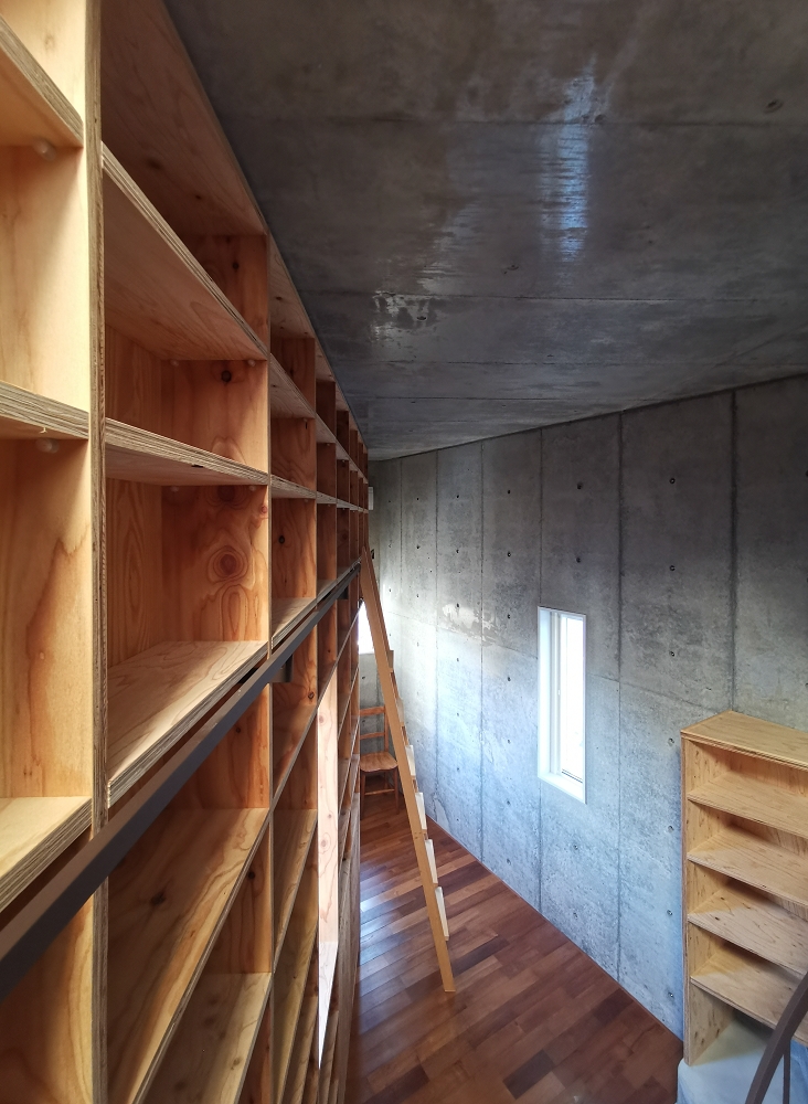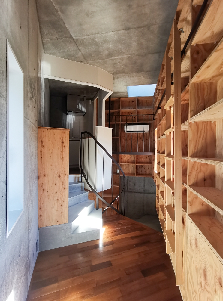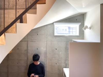 単身で生活をするための小規模な住宅です。6.4坪の土地に建つRC造2階建ての建築です。最初の話合いでクライアントが自ら描いた平面図を受け取りました。ほぼその通りに出来上がっています。1層当り5坪に満たないそのプランの半分近くを階段が占めています。この階段には当初驚き戸惑いました。しかしこの緩勾配の大きな階段は、1・2階を一体にする、階段それ自体が居場所になる、将来も上りやすい、といった点で合理的です。熟考されたものであること、クライアントにとって自然、普通なものであることが徐々に理解されていきました。
