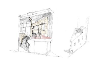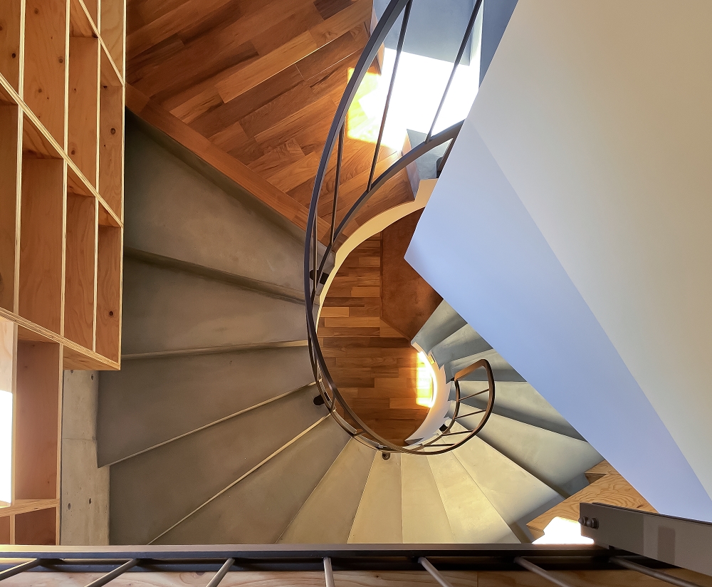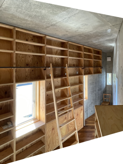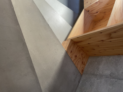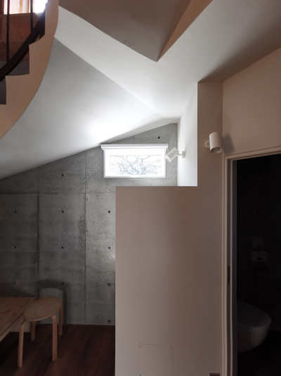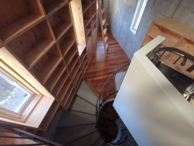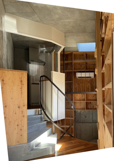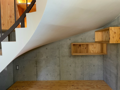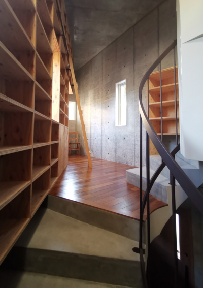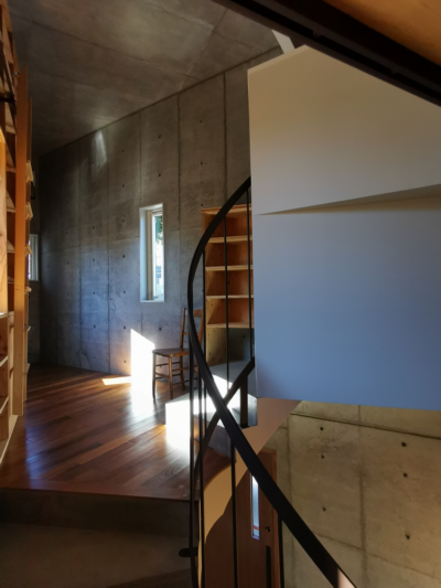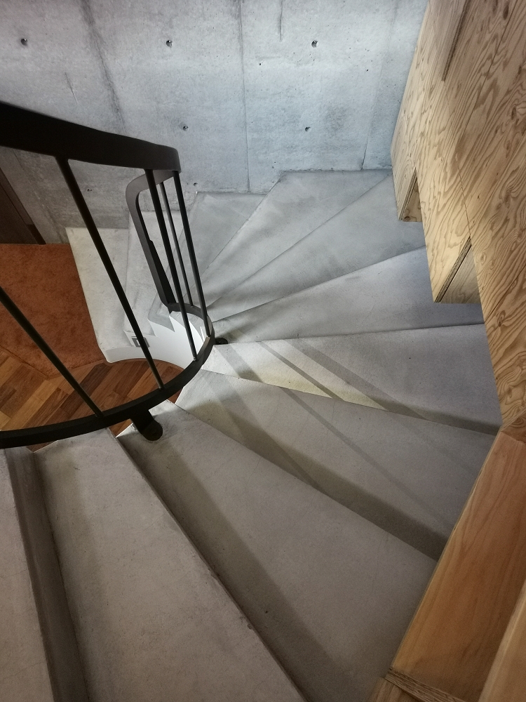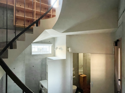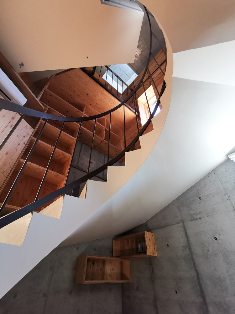 単身で生活をするための小規模な住宅です。6.4坪の土地に建つRC造2階建ての建築です。最初の話合いでクライアントが自ら描いた平面図を受け取りました。ほぼその通りに出来上がっています。1層当り5坪に満たないそのプランの半分近くを階段が占めています。この階段には当初驚き戸惑いました。しかしこの緩勾配の大きな階段は、1・2階を一体にする、階段それ自体が居場所になる、将来も上りやすい、といった点で合理的です。熟考されたものであること、クライアントにとって自然、普通なものであることが徐々に理解されていきました。